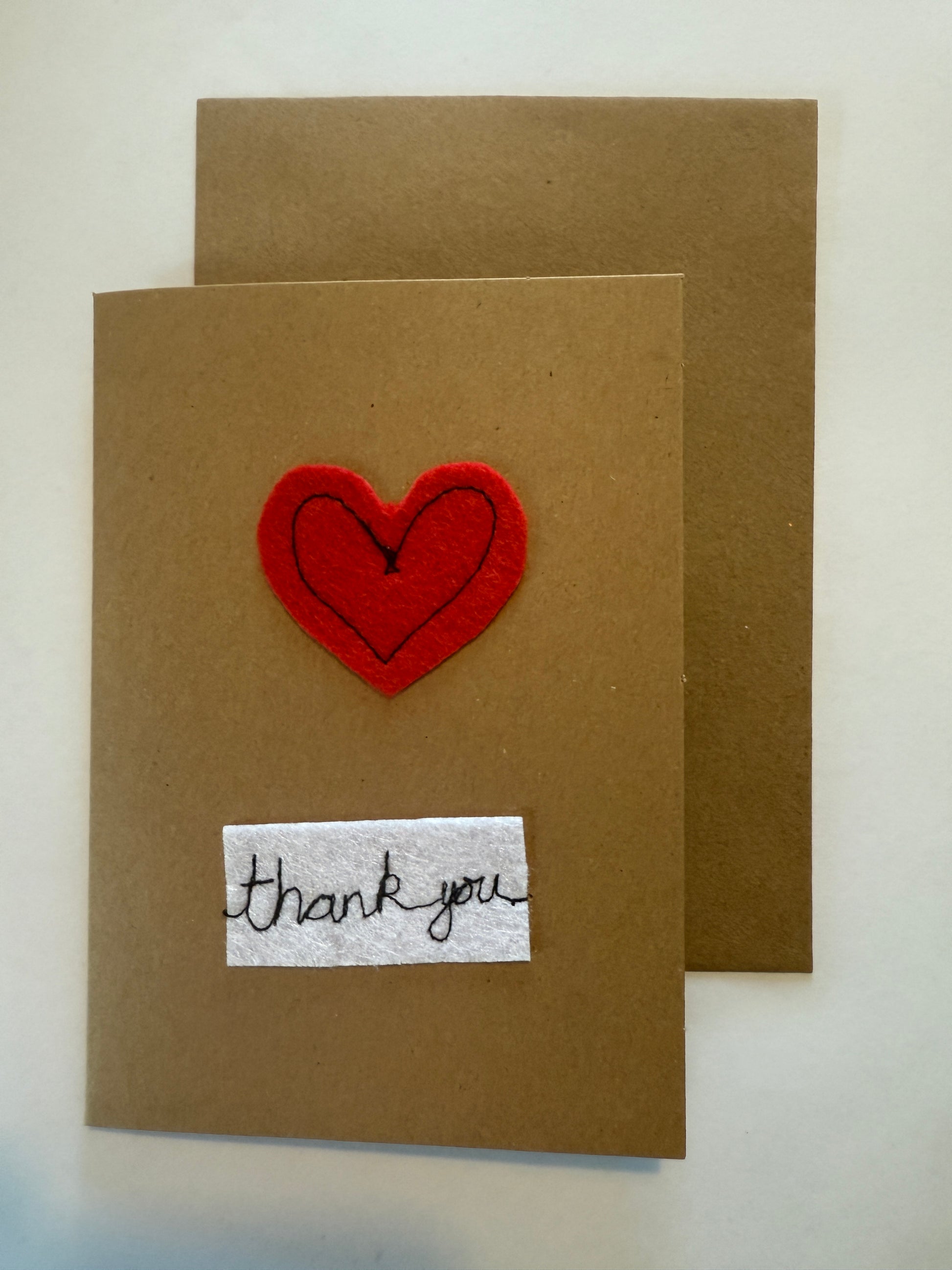Thank You card features a beautiful red felt embroidered heart, adding a special touch to your appreciation. Made with high-quality materials, this card is the perfect way to express your gratitude in a unique and heartfelt way. Show your appreciation with this elegant and thoughtful card.